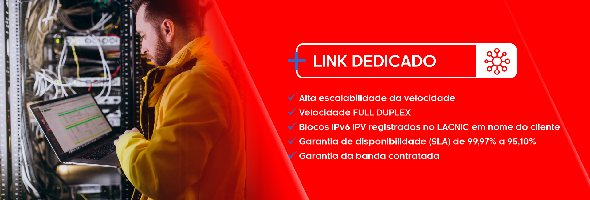 Link dedicado é um canal exclusivo direto da operadora para a sua empresa, proporcionando alta velocidade, estabilidade de conexão, IP Fixo, garantia de banda total sem interferência de terceiros, tempo de recuperação super rápido em caso de interrupção.